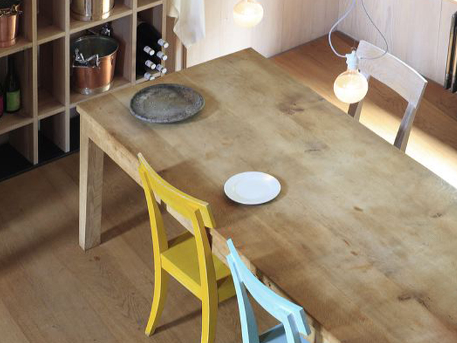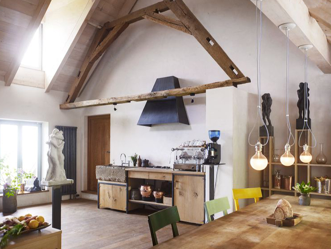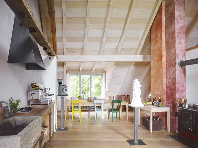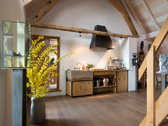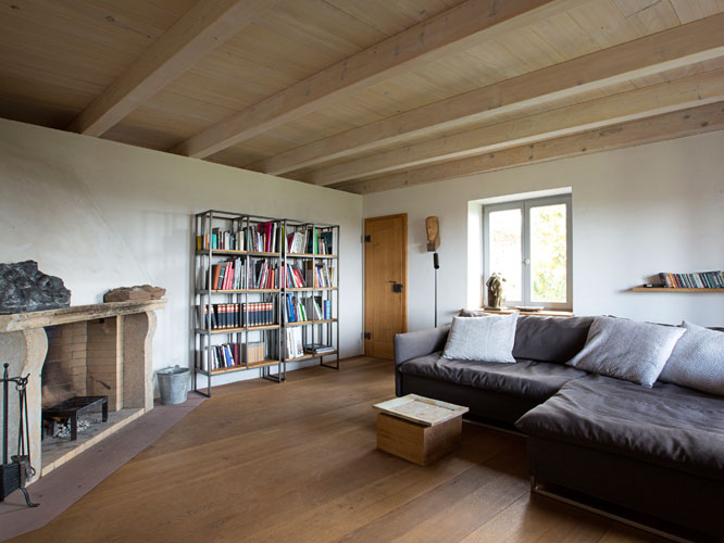 Unter dem hohen, alten Dachstuhl aus dem Jahr 1719 gehen Küche, Esszimmer und Bibliothek nahtlos